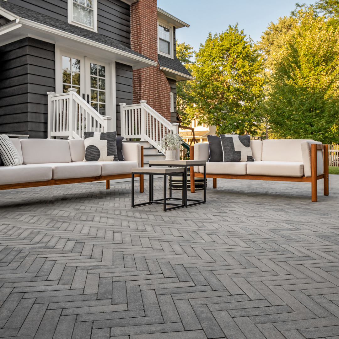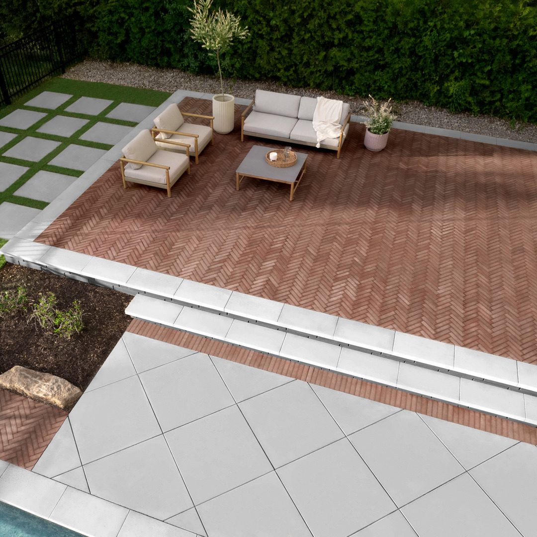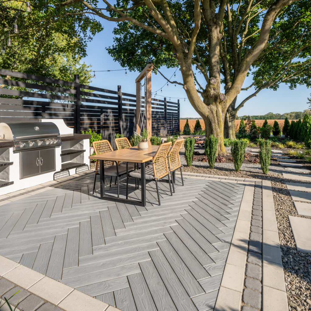 This backyard dining area features Techo-Bloc’s Borealis slab in a stunning herringbone pattern, creating the cozy, inviting vibe of an indoor dining room – outdoors!