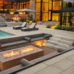 Seen here: Techo-Bloc’s Westmount pavers in Chestnut Brown laid in a herringbone pattern for that “indoor vibe” outdoors.